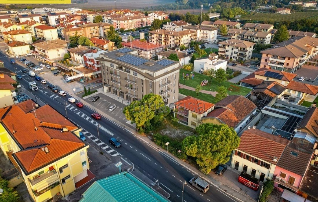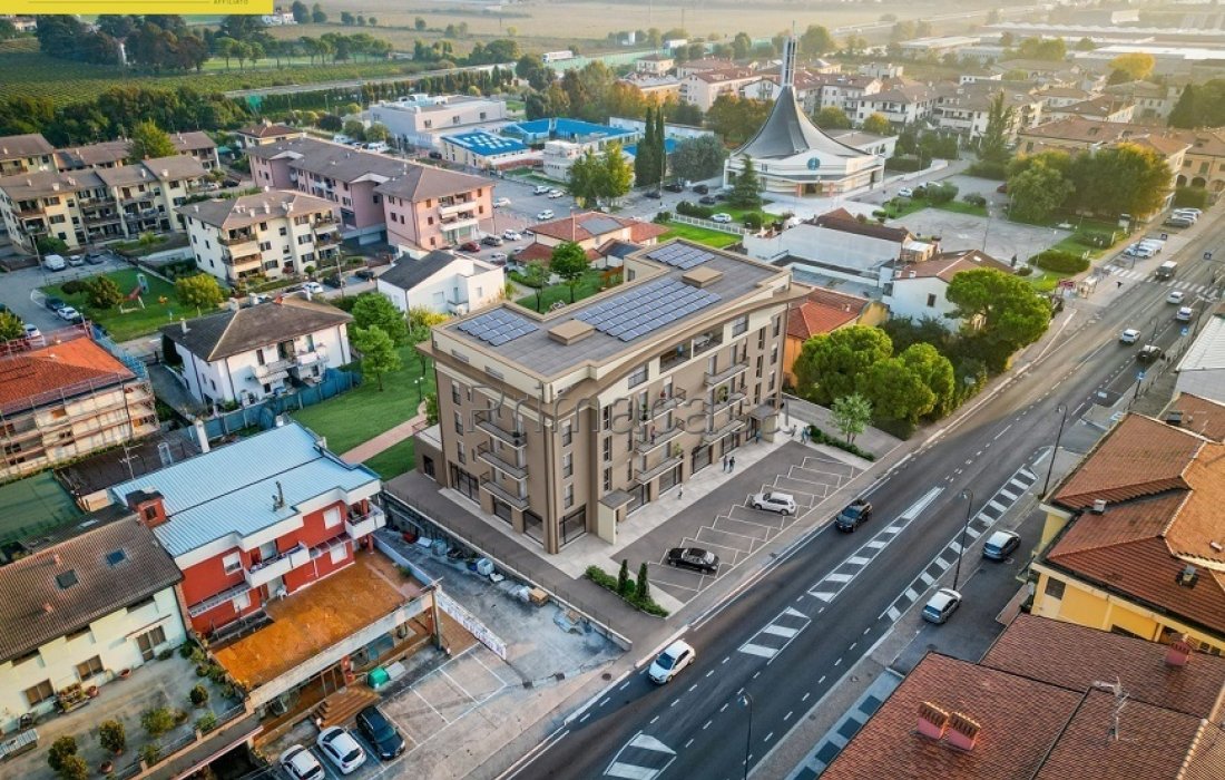 NUOVO COMPLESSO RESIDENZIALE "DIANA": in centro paese, trilocale in classe A4 al piano secondo con ascensore composto di soggiorno con angolo cottura (28 mq), 2 camere da letto, 2 bagni finestrati e 2 balconi. Garage. Riscaldamento a pavimento in pompa di calore, impianto fotovoltaico condominiale, VMC, impianto di climatizzazione, infissi in PVC, cappotto da 14 cm. Rif. 2839